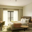 Conta com quatro pisos e 95 quartos — sendo 80 deles quartos twin. Ao longo dos seus quatro andares arquitetados para homenagear a cultura alentejana, vai encontrar ainda um um bar e uma piscina no rooftop, um ginásio e 163 lugares de estacionamento, incluindo postos de carregamento elétrico.