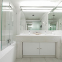 Um dos aspetos que mais me encantou nesta unidade do grupo Solverde é a ausência de pseudo-luxos, como amenities de marcas caríssimas que, depois, quando a pessoa vai usar, têm a mesma qualidade de um champô ou gel de banho de supermercado (tema para toda uma outra crónica). Aqui não há nada disso, só o mais básico, e não faz grande falta. A casa de banho é enorme e bem iluminada. A vista vale praticamente tudo, e o quarto até podia nem ser o mais confortável que, ainda assim, compensaria. Não é o caso e, admito, aproveitei para dormir uma soneca no sofá antes de ir relaxar para o spa (vidas difíceis, eu sei, mas alguém tem de as ter).