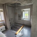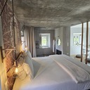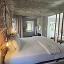 Ficámos alojados numa Suíte Superior, que tem capacidade máxima para quatro pessoas. A zona de lazer, com dois confortáveis sofás, kitchenette e mesa de jantar está harmoniosamente interligada com o quarto, tudo em open space. A grande estrela desta tipologia é a enorme zona de banho (é redutor chamarmos-lhe banheira) que, com a dimensão de uma piscina, permite um banho de imersão a dois, sempre a olhar para a lareira (que está pronta a acender). Pode também tomar um duche inesquecível a olhar para a placidez da natureza da propriedade, porque o chuveiro XXL suspenso do tecto permite uma liberdade de movimentos, enquanto o espelhos colocados no tecto e na parede criam amplitude e harmonia (e a água tem a pressão e a temperatura certas).