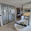 A suíte tem duas televisões, o que achámos um pouco extra, embora não nos tenha incomodado. Há uma planta natural, algo pouco comum num hotel de cidade, o que torna a estadia ainda mais especial. A casa de banho com chuveiro duplo e banheira no centro é o coração da suíte, convidando ao relaxamento total depois de um dia a passear (ou a trabalhar na cidade).