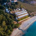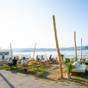 No espaço exterior, há zonas de estar para descansar, baloiços suspensos, bar e até um pequeno beach club com esplanada virada para o mar, perfeito para beber um copo ao pôr do sol.