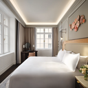 São 138 quartos e suítes distribuídos por quatro pisos, com vistas para um pátio interior silencioso ou para a rua histórica envolvente. A decoração aposta em tons suaves, materiais nobres e referências subtis à Secessão Vienense, criando um ambiente sereno, pensado para descansar depois de um dia entre museus, cafés históricos e salas de concerto.