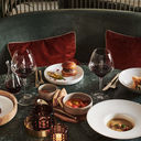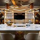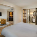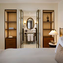 Há elementos como mármore e bronze, que são combinados com móveis pensados à medida, cortinados e alcatifas de tons claros “harmonizadas com o rústico parquet de carvalho e os apainelados de madeira artesanais”.