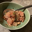 Os rolos primavera thai fresco ou frito (9€ por 3 peças), com hortelã, coentros, manjericão tailandês, salsa, pepino, cenoura e molho picante, dificilmente desiludiriam. Ainda assim, preferimos o miang goong: camarão tigre preto, compota de malagueta, erva-limão e pedaços de folhas de lima kaffir para picar (15€ por 5 peças).